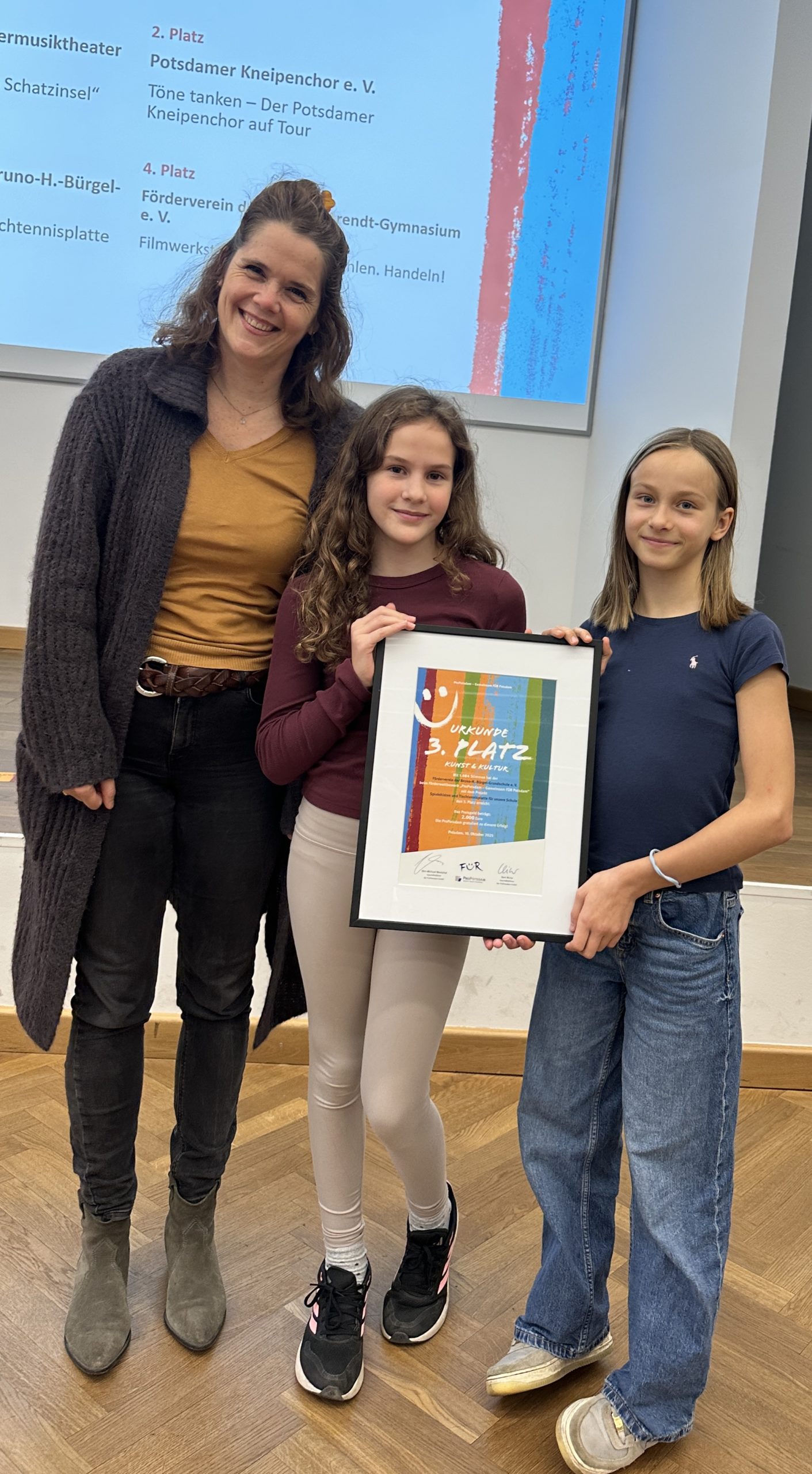Am Freitag, den 10. Oktober 2025 waren Annie und Mira aus der Konferenz der Schülerinnen und Schüler gemeinsam mit Frau Kapp bei der Preisverleihung im Museum Potsdam. Da unsere Kategorie „Kunst und Kultur“ als letzte verlesen wurde, blieb es bis zum Schluss spannend! Umso größer war die Freude über unseren Erfolg! Die Veranstaltung war sehr schön gestaltet – mit musikalischer Begleitung, wohlüberlegten Worten und zum Abschluss gab es sogar noch leckeren Saft und Kuchen 😊