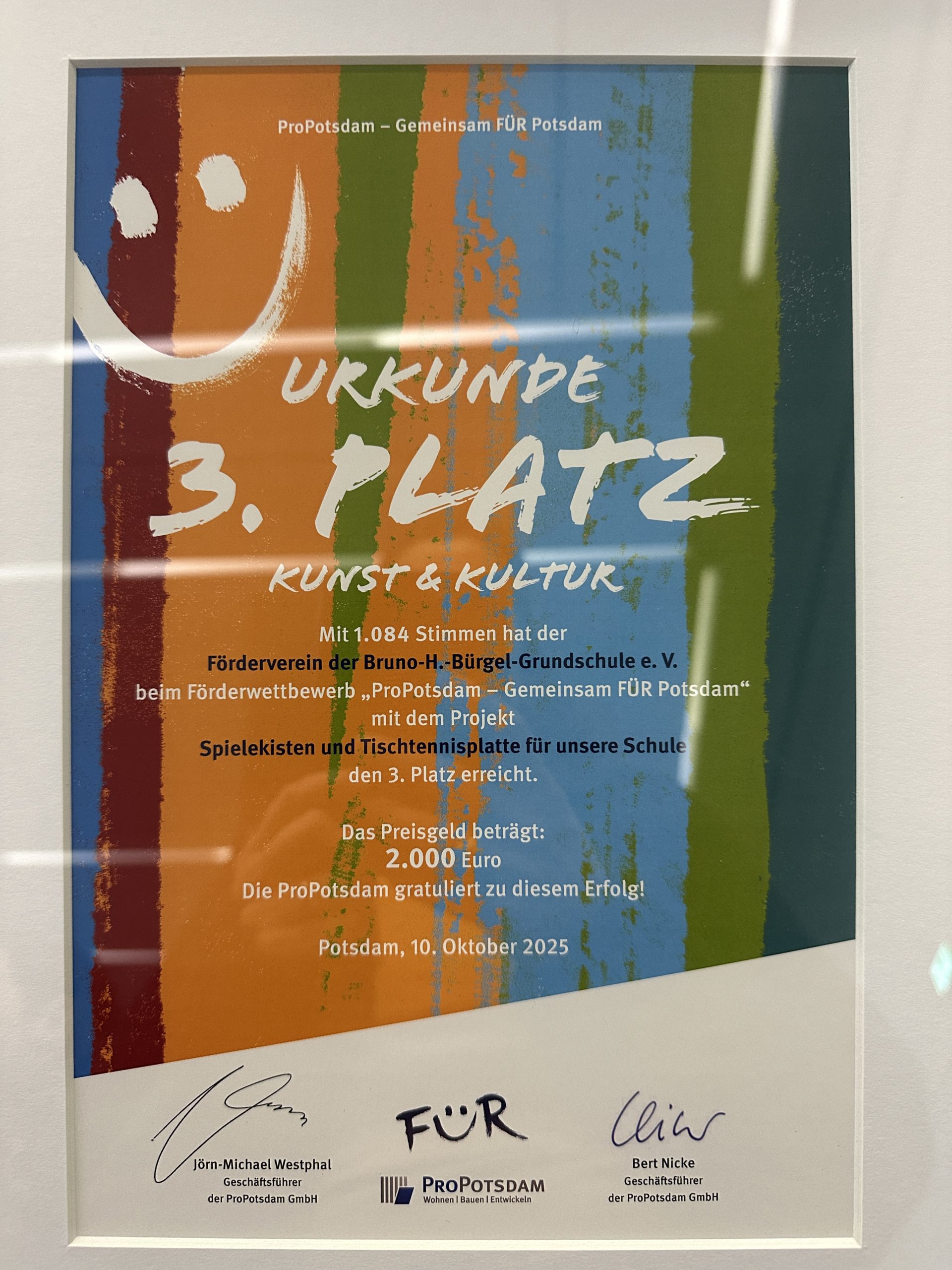 Unsere Schule hat sich mit dem Projekt „Spielekisten und Tischtennisplatte für unseren Schulhof“ zum dritten Mal am Wettbewerb „ProPotsdam – Gemeinsam für Potsdam“ beteiligt.