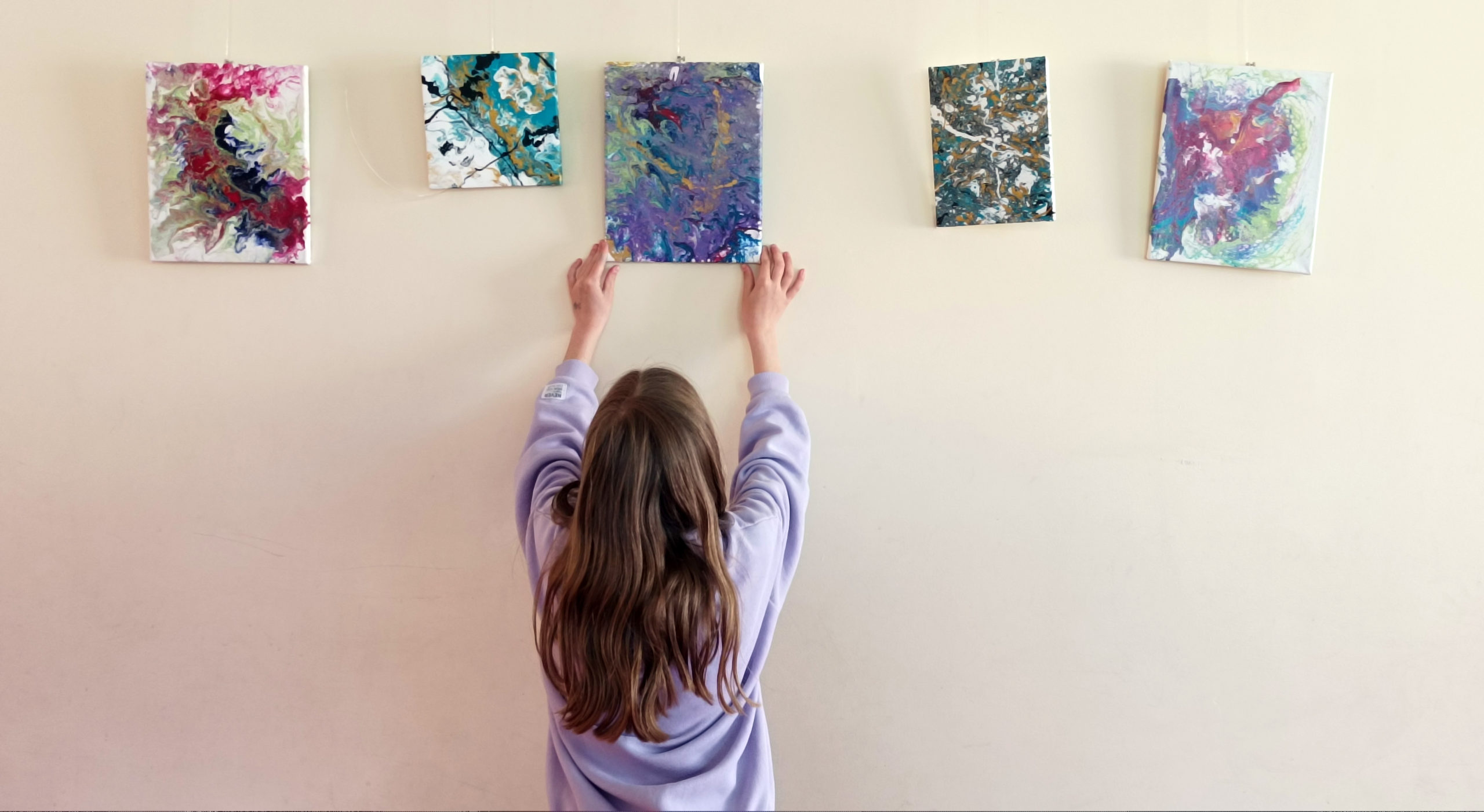 Nun sind die Bilder fertig und die erste Ausstellung gestaltet mit den Bildern von Elisabeth aus der Klasse 5b. Es wird immer neu gestaltet mit Schülerarbeiten, auch aus dem Kunstunterricht.