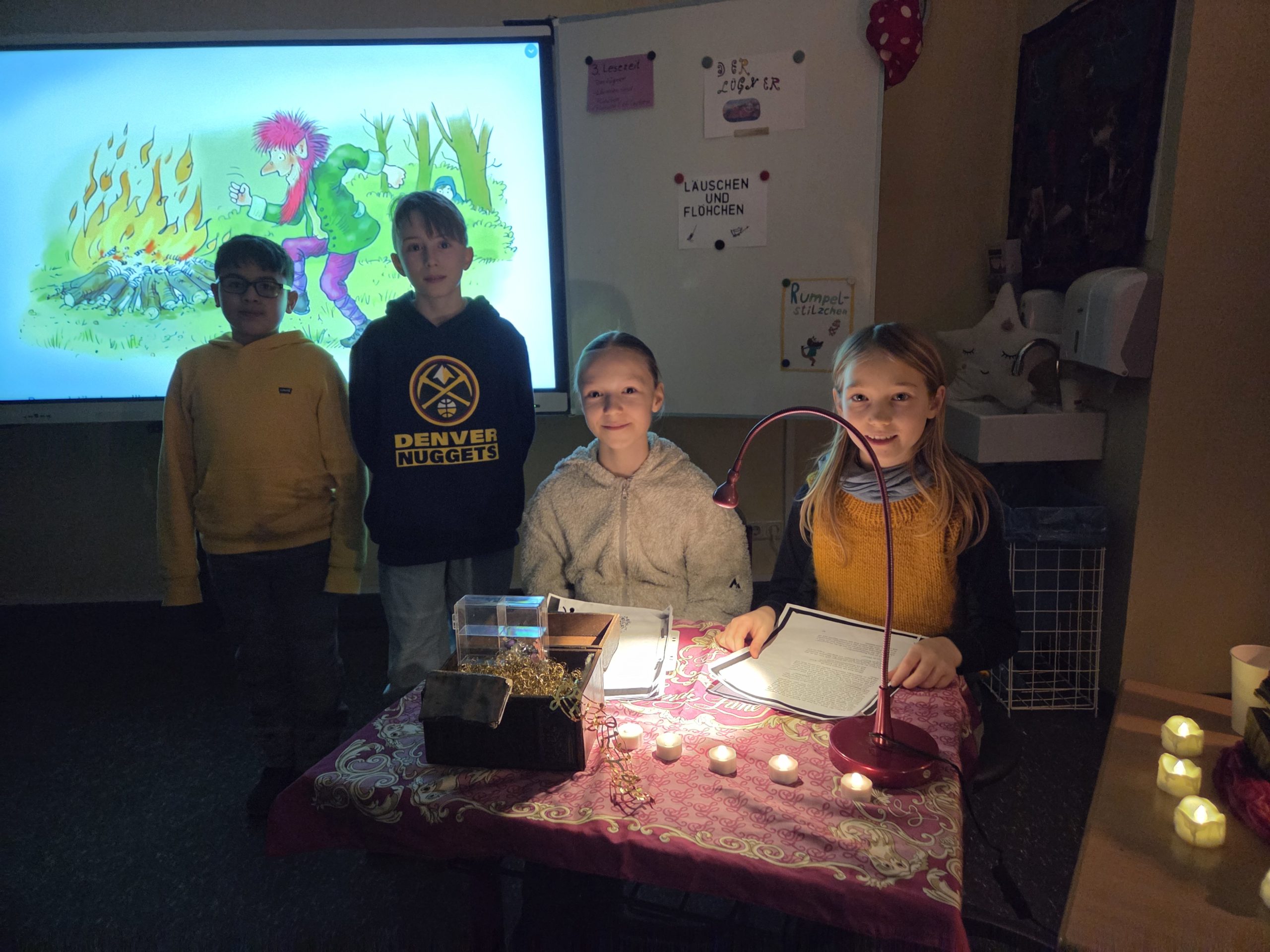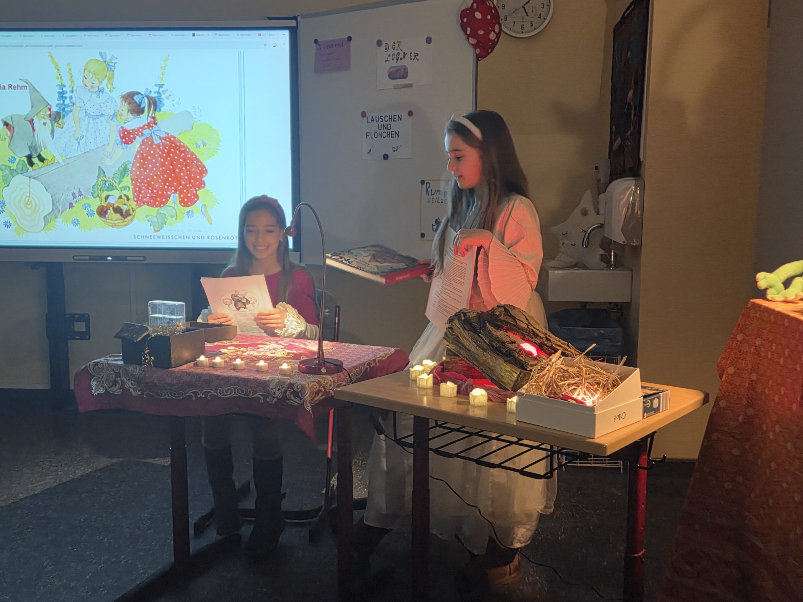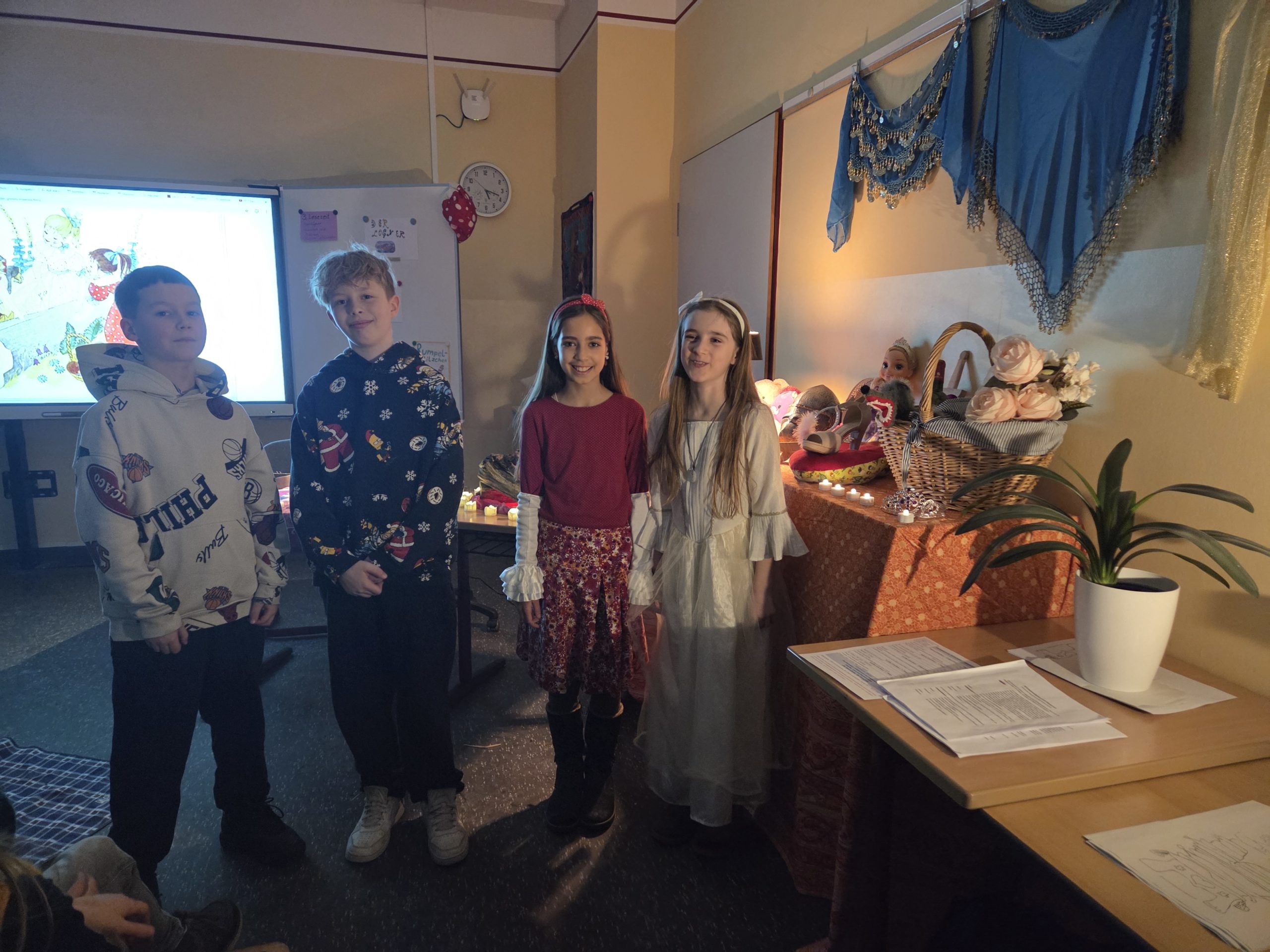 Im Klassenraum der 4b wurden Märchen vorgelesen und er war sehr schön geschmückt. Es hat mir sehr gefallen. Am besten hat mir das Märchen „Frau Holle“ gefallen.