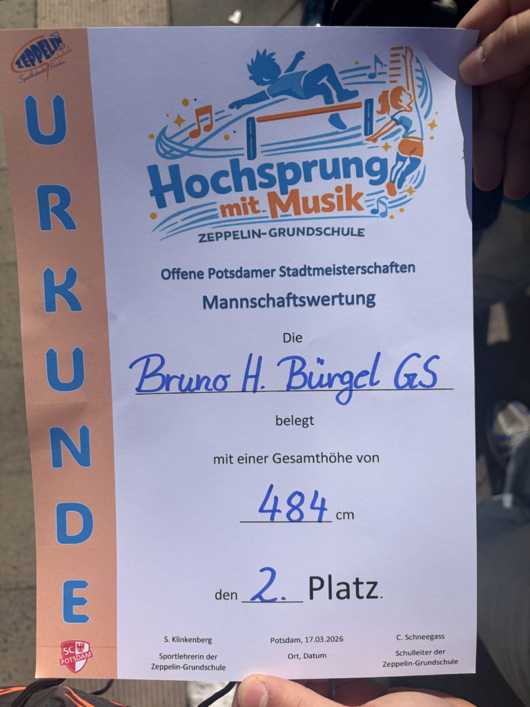 Am Dienstag, dem 17.03.2026, fand an der Zeppelin-Grundschule ein sportlicher Wettkampf in der Disziplin Hochsprung statt. Die sieben Schüler und Schülerinnen der Bruno-H.-Bürgel-Grundschule belegten dabei einen hervorragenden zweiten Platz. Herzlichen Glückwunsch an unsere Sportler!