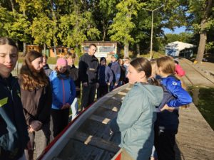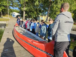 Die Mädchenmannschaft nahm das Boot namens „Rote Socke“, die Jungen ein grünes Boot. Dann ging es, nach einer Trockenschulung im Paddelbenutzen, bei Sonnenschein auf das Wasser hinaus. Herr Vandrey gab noch ein paar praktische Tipps bezüglich des gemeinsamen Paddelns und betätigte sich als Steuermann.
