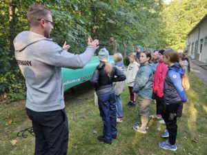 Die Kinder der Klasse 6b kamen gut gewandet und mit großartigem Picknick zur Schule und waren auch noch ganz frohgemut. Das Wetter spielte mit und die Bahn fuhr planmäßig. Wir kamen pünktlich an und die Kinder nahmen ein ausgiebiges Frühstück ein. Dann stellte sich Herr Vandrey vor und gab einen Ausblick auf die kommenden Stunden.