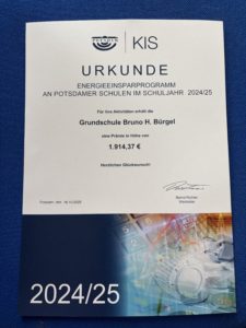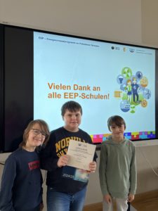 Die Mitglieder der Umwelt-AG konnten im Namen der gesamten Schule einen Preis des Energiesparprojektes an Potsdamer Schulen (EEP) für unser Engagement im Klimaschutz entgegennehmen. Durch zahlreiche alltägliche Aktionen – vom bewussten Energiesparen über nachhaltige Mobilität bis hin zu Müllvermeidung und Recycling im fächerübergreifenden Kontext – wurden über 5.000 Punkte gesammelt. Damit haben wir uns sowohl im Ranking und hinsichtlich der erzielten Punkte deutlich verbessern können.
